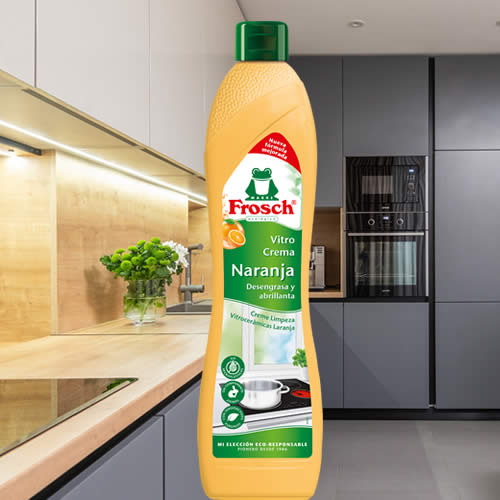 Frosch Vitro Crema Naranja elimina eficazmente suciedad incrustada y quemada en placas de vitrocerámica, placas de inducción, acero inoxidable y superficies de esmalte y cerámica.