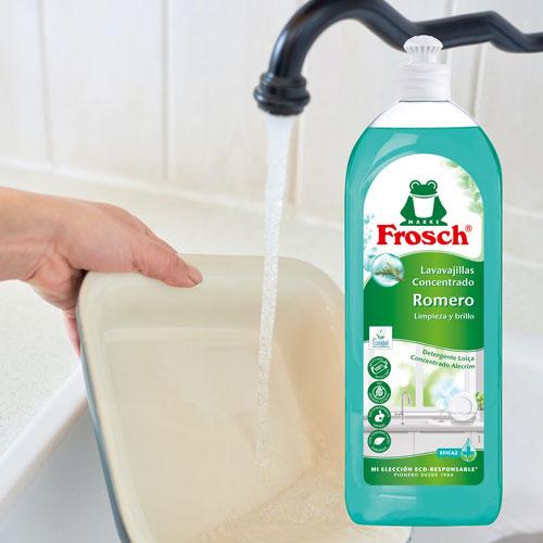Frosch Lavavajillas Romero desengrasa y limpia la vajilla dejándola brillante, incluso en tablas de cortar y vajillas o recipientes de plástico.