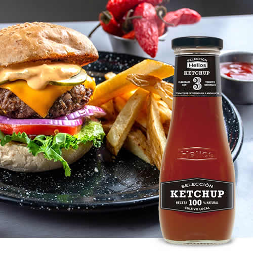 Nuevo Kétchup Helios Selección. Elaborado con 3 tomates de la huerta de Extremadura y Andalucía, una receta 100% natural con ingredientes de cultivo local.