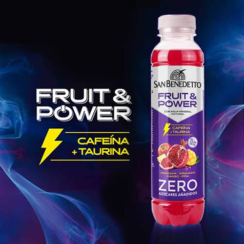 San Benedetto Fruit & Power es la marca de bebida energética sin gas de Agua Mineral San Benedetto. Una propuesta novedosa gracias a su práctico formato en PET y su alto contenido de zumo de fruta, agua mineral y sin azúcares añadidos, a diferencia de otras marcas.