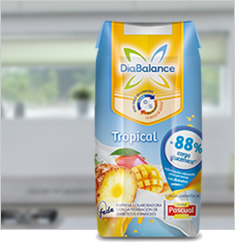 La Bebida Tropical Diabalance es una bebida refrescante mixta de zumo de frutas (piña, uva, mango) y leche. Sin azúcares añadidos, contiene azúcares naturalmente presentes. Con una reducción de carga glucémica del 88%*. Para cuidarse y disfrutar.