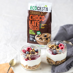 Deliciosa Granola con chocolate y coco sin gluten Bio de Ecocesta. Ideal para los desayunos de toda la familia. Rica en avena integral y con alto contenido en fibra. ¡Sin azúcares refinados, sin gluten y de cultivo ecológico!
