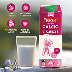 Nuevo Pascual Calcio. Nuestra leche de siempre, enriquecida con calcio (50% CDR*) y ahora un alto contenido en Vitamina D (100% CDR*), para seguir cuidando tus huesos y tu sistema inmunitario.