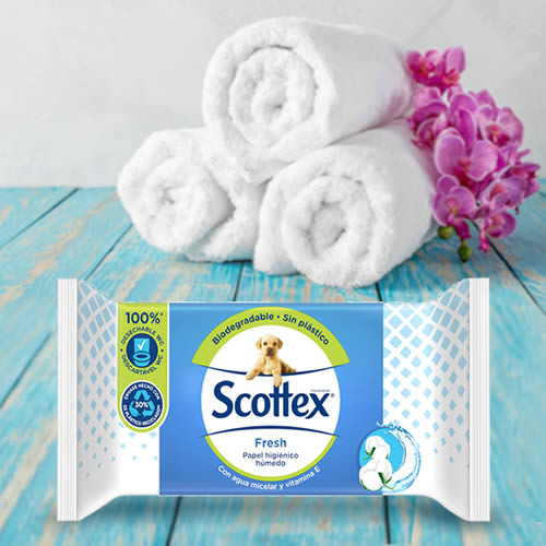 El papel higiénico húmedo Scottex® Fresh es biodegradable, no contiene plásticos y es 100% desechable por el WC.